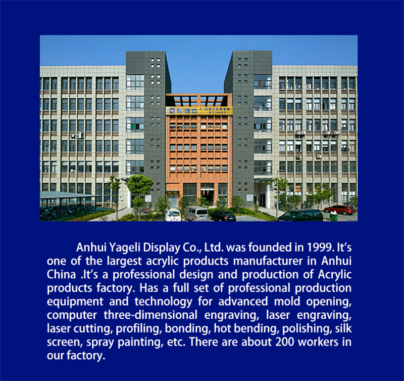 Anhui Yageli Display Co.,Ltd., Расположен в городе Хэфэй, провинция Аньхой, Китай. Компания, основанная в 1999 году, является одним из крупнейших производителей в сфере профессионального производства акриловых выставочных изделий и акриловых листов.