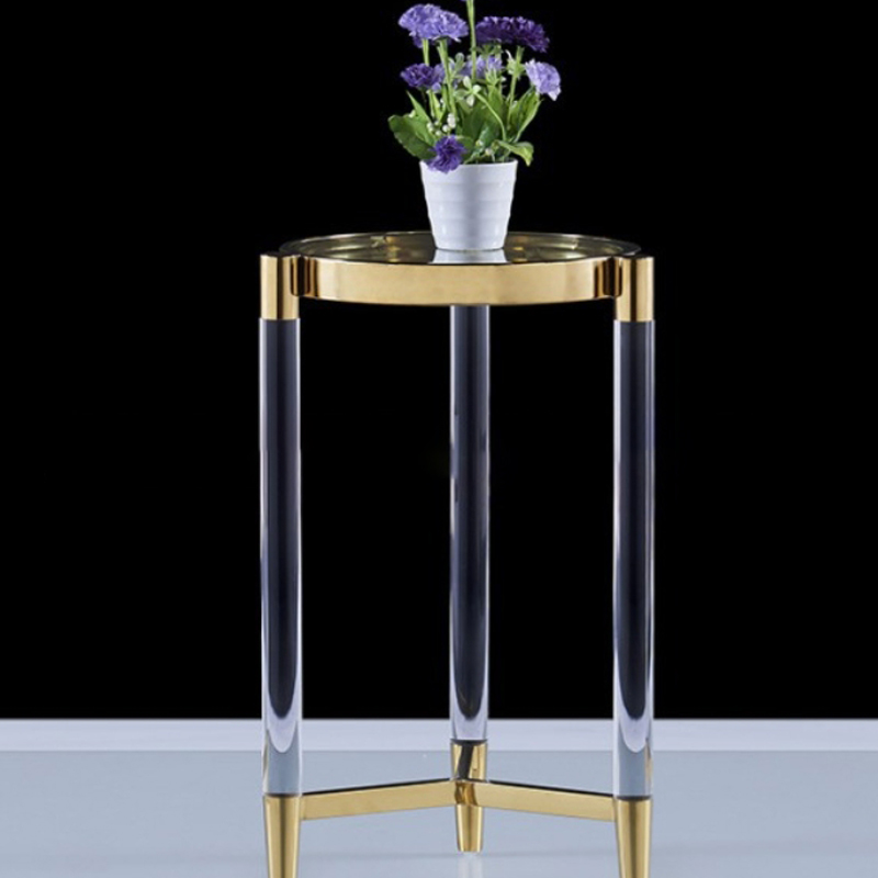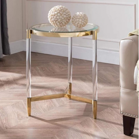 Этот современный круглый журнальный столик имеет гладкую прозрачную стеклянную столешницу, поддерживаемую позолоченным металлическим каркасом и прозрачными акриловыми ножками, что делает его стильным и элегантным центральным элементом вашей гостиной.