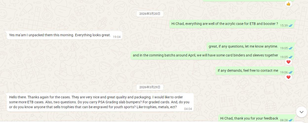 YAGELI — это профессиональная китайская фабрика, производящая высококачественные держатели для карт и жесткие держатели для карт на международном рынке. Будучи прямым производителем (а не торговой компанией), YAGELI предлагает стабильное массовое производство, строгий контроль качества и возможности индивидуальной настройки жестких держателей для карт, полужестких держателей, магнитных футляров для карт и градуированных картонных футляров, что делает ее предпочтительным поставщиком для зарубежных дистрибьюторов и брендов коллекционных карточек.