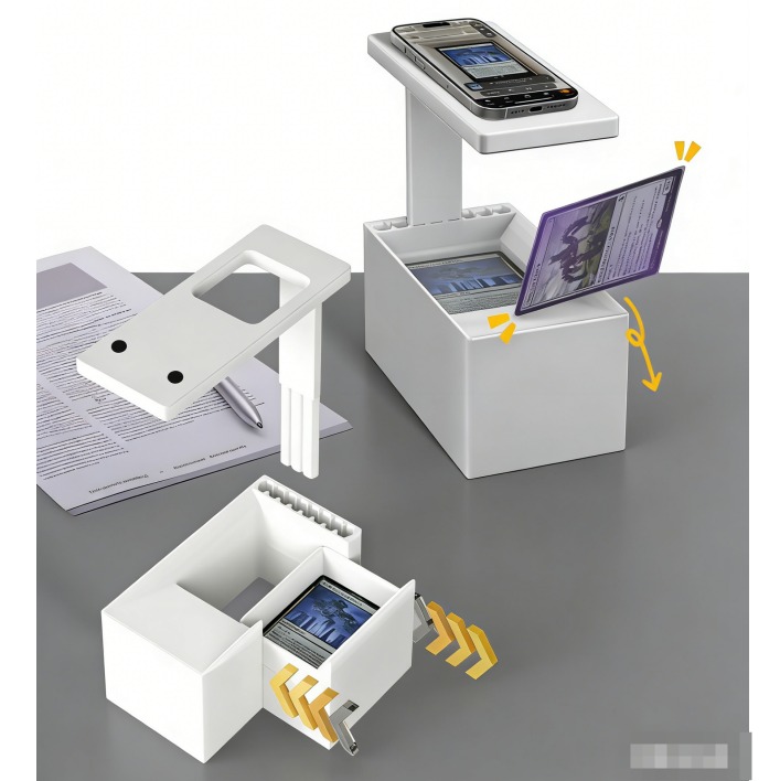 Он держатель для сканера коллекционных карточек Регулируемая по высоте конструкция обеспечивает совместимость с различными мобильными устройствами и системами сканирования. Сбалансированная конструкция гарантирует устойчивость карт, повышая точность сканирования при непрерывной работе.